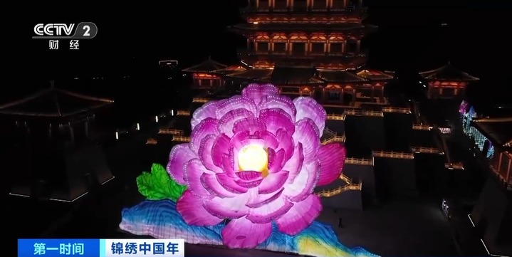 灯会上,被吉尼斯世界纪录官方认证最大的立式花灯首次公开亮相。彩灯采用800年自贡彩灯手工工艺,高24米,6层巨型“花瓣”托底,由200多位手工匠人历时17天制作完成。