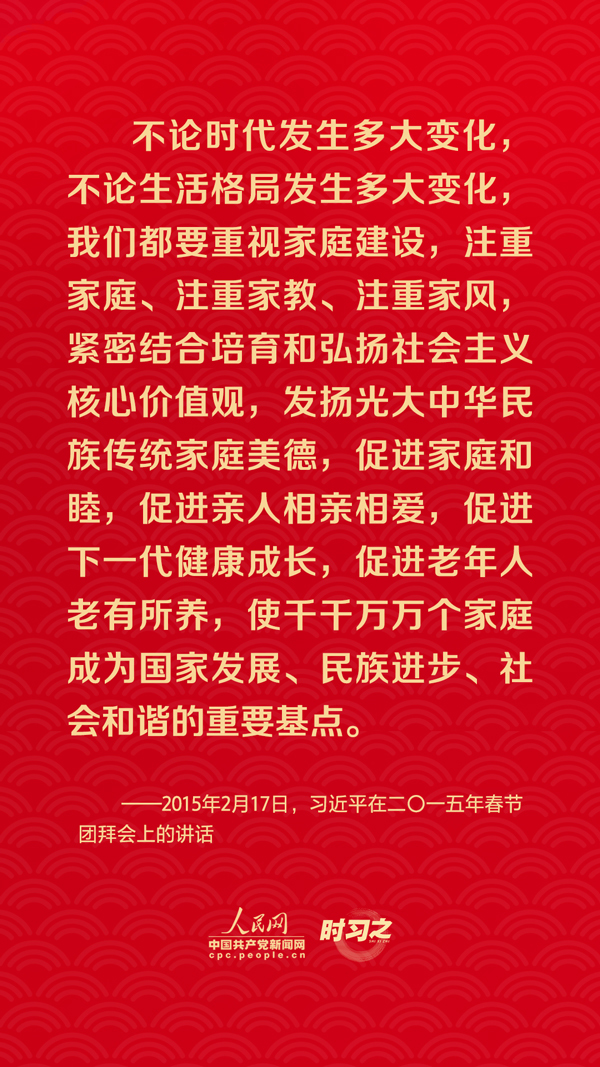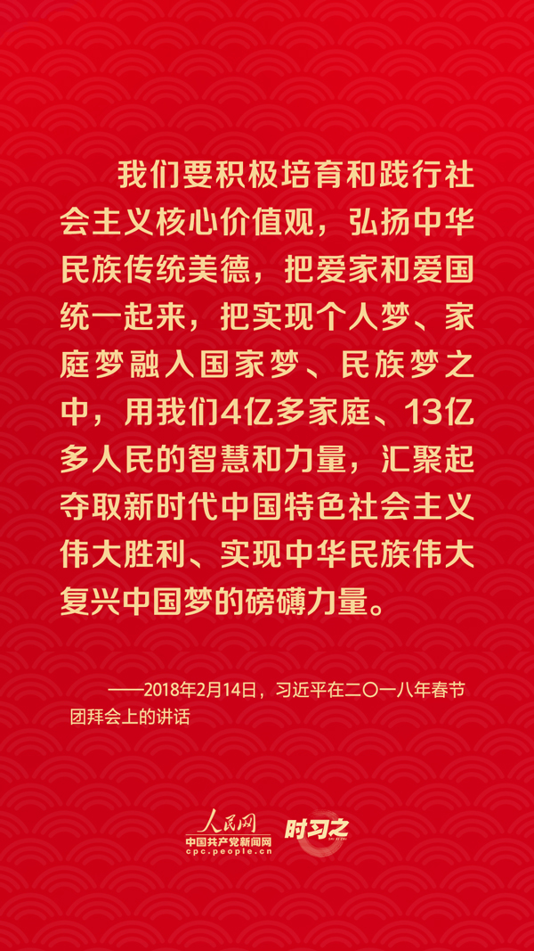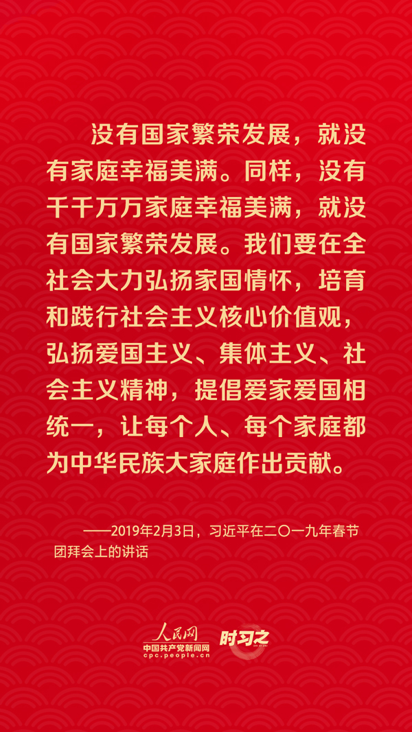 团圆是春节永恒的主题。“没有国家繁荣发展,就没有家庭幸福美满。同样,没有千千万万家庭幸福美满,就没有国家繁荣发展。”习近平总书记曾在多个场合深刻阐述家庭与国家之间的关系,从他的话语里一起感悟深厚的家国情怀。