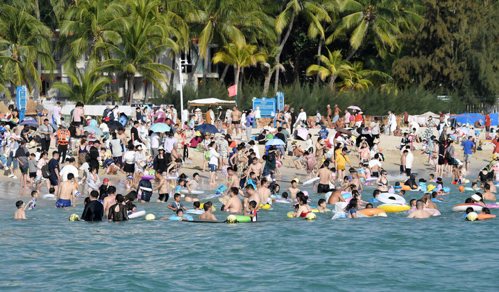 2月13日,游客在海南省三亚市大东海景区戏水。 当日是大年初四,人们在丰富多彩的活动中过大年、庆新春。 新华社记者 赵颖全 摄
