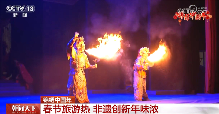 在成都四川省川剧院,全国首个以川剧元素为主题的创新剧《芙蓉国粹川剧秀传奇变脸》正在上演,春节期间场场爆满。结合声光电等全新舞美效果,提炼出传统川剧中更具特色的变脸、吐火、木偶变脸等绝活儿,结合演员的唱念做打与观众进行近距离互动,吸引了许多春节期间来成都的外地游客专门前来。