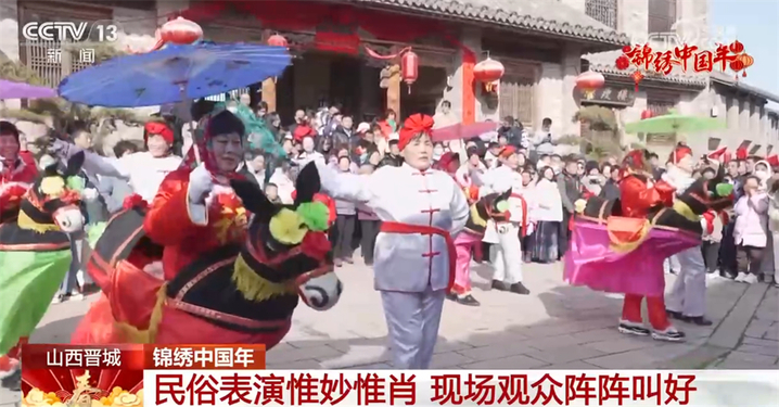 在山西晋城泽州县大阳古镇景区,演员身着色彩鲜艳的古装,伴着欢快热闹的小调,自编自演的民俗表演轮番登场,担花篮、划旱船等特色传统民俗节目演绎得惟妙惟肖,赢得现场观众阵阵叫好。