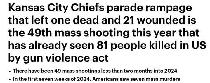 根据该组织对大规模枪击事件的定义,美国今年已经发生了49起不含枪手在内有4人遭枪击受伤或死亡的事件。最新的一起发生在14日举行的美国职业橄榄球大联盟“超级碗”胜利游行中,事件导致1人死亡,22人受伤。