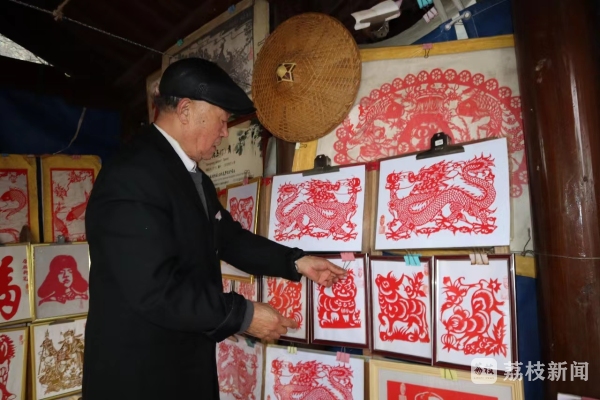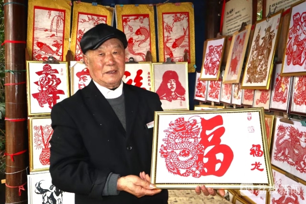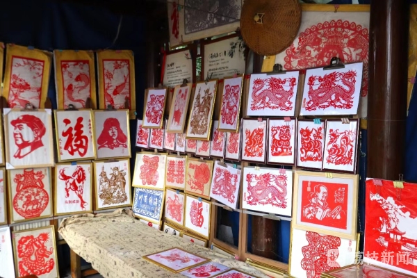缪小福的剪纸铺里,目之所及都是各式各样、造型别致、寓意深刻、技法精湛的剪纸作品。双龙戏珠、金龙迎春、一飞冲天等一幅幅生动的原创龙年主题剪纸更是被摆在了醒目位置。