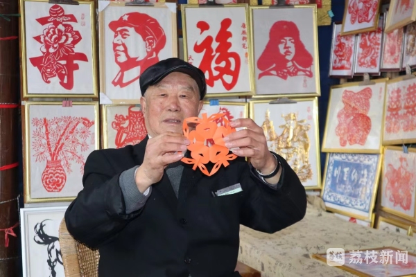 “来来来,爷爷把这个苹果形状的剪纸送给你们,祝你们新的一年平平安安。” 昨天(2月15日),记者在常州溧阳市天目湖山水园景区看到缪小福的时候,他正把自己刚刚剪好的作品送给前来景区游玩的孩子们。今年79岁的他,虽已近耄耋之年,却依然精神矍铄。