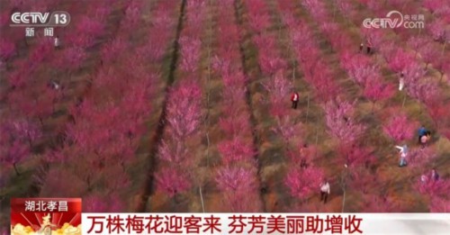在湖北孝感孝昌县邹岗镇,万株梅花也竞相绽放,吸引了众多市民游客来此“寻梅”。走进梅园,一簇簇梅花缀满枝头,蜜蜂飞舞其间,市民游客漫步在花海中,拍照记录美好风景。