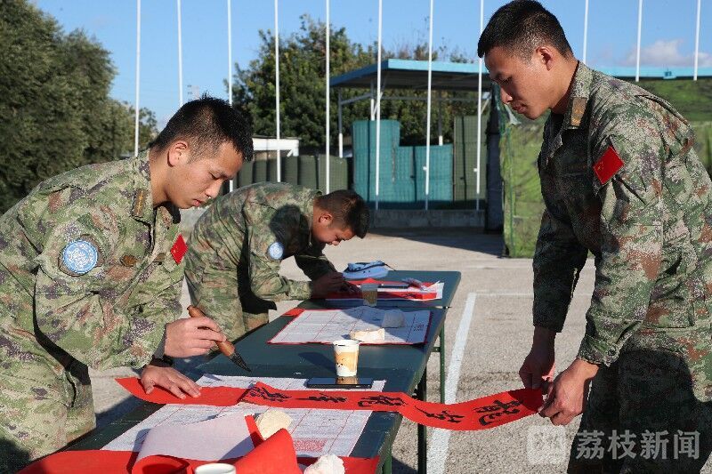 挥毫泼墨,手写春联,一幅幅充满军味、战味的春联为维和营增添了一份浓郁的中国年味。行书、隶书、楷书……长桌上的春联一字排开,纸张上呈现出各种不同字体。官兵们在案桌前裁纸、调墨,讨论着楹联知识,欣赏着翰墨丹青,互相交流书法技艺、学习心得。
