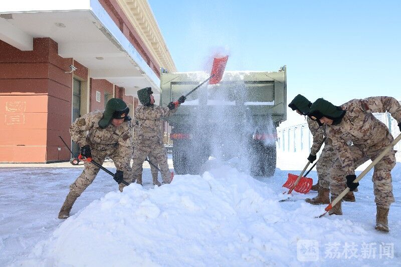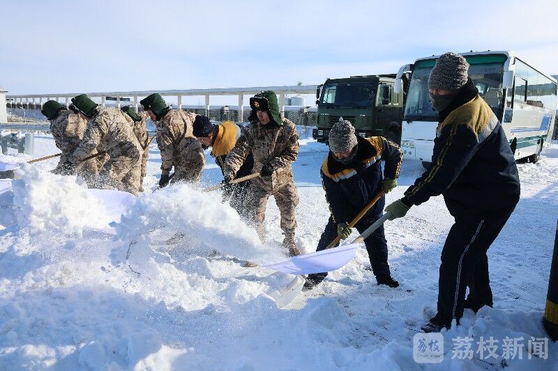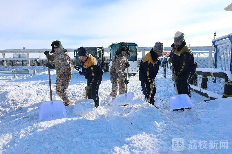 任务中,官兵们克服极寒天气影响,携带60余件套清雪器材,连续作业3个小时,警戒、扫雪、除冰,开辟安全通道,为来往旅客保驾护航。