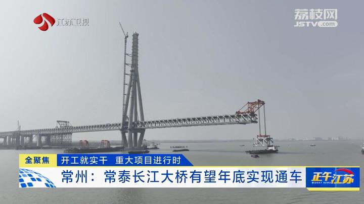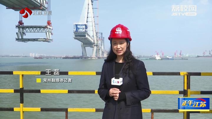 常州台记者王磊说:“拼字当前,实干争先。在常泰长江大桥的施工现场,工人们铆足干劲,吹响复工集结号。在我身后,重达1600多吨的大节段钢梁正在缓缓上升,这也是项目龙年复工的第一次吊装作业。”