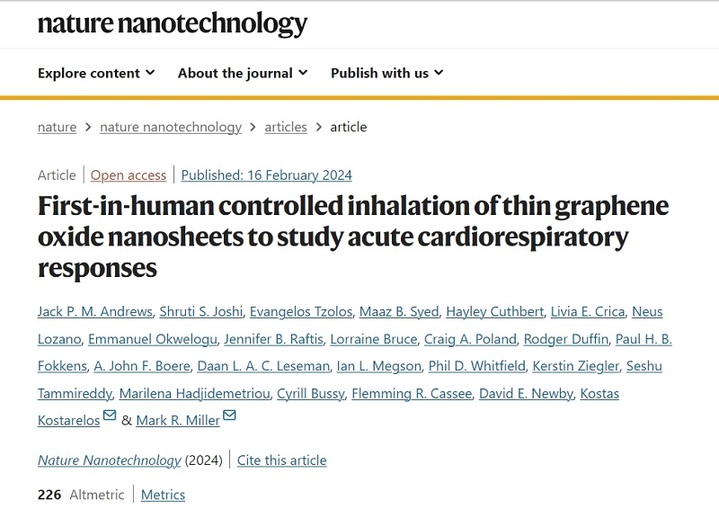 结果表明,吸入超纯氧化石墨烯对肺功能、血压或大多数其他生物参数没有不良影响。研究人员注意到,有轻微的迹象表明,吸入这种物质可能会影响血液凝块的方式,但这种影响非常小。不过,仍需进一步调查以确定更高剂量和长时间接触石墨烯的潜在影响。