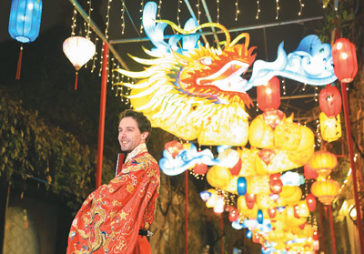 第38届中国·秦淮灯会近日在南京亮灯。图为一名外国游客在南京老门东景区赏灯留影。 |