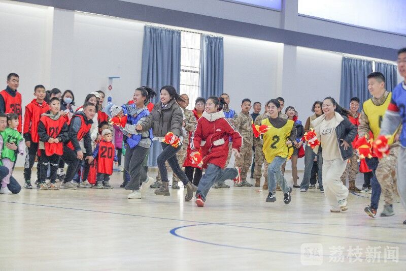 在该部体育馆内,数十支亲子参赛队穿着整齐服饰向新年发起冲锋!“龙腾接力跑”、“亲子深蹲”、“双人跳绳”、“脚踩风火轮”、“螃蟹运球”、“你抛我接”、“二人三足”……比赛场上,官兵及家属齐心协力,斗志昂扬。