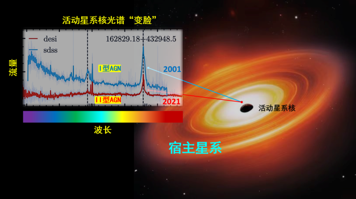 活动星系核是星系中心极其明亮的致密区域,其辐射非常剧烈,是宇宙中最亮的持久电磁辐射源之一。“变脸”活动星系核是一种特殊的活动现象,就像川剧变脸一样,它们的活动形态会在短时间内发生转变。这种快速“变脸”事件极大地挑战了传统的活动星系核统一模型,对理解超大质量黑洞吸积过程与宽线区结构,以及活动星系核与星系协同演化都具有重要意义。