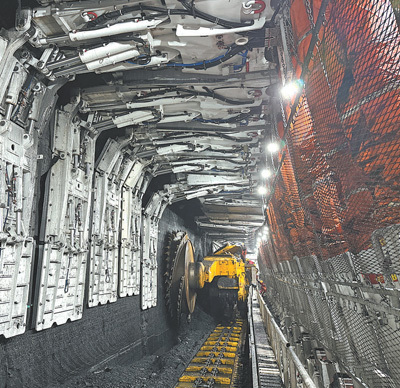 上午10时许,换上橙黄色工作服,记者乘坐特制防爆车进入矿区井下,约半小时后,到达地下300米深的工作面。只见煤巷中,一台100多米长的掘进装备正旋转着滚筒破开煤层,一边向前掘进,一边支护巷道。