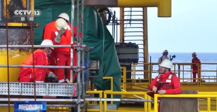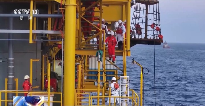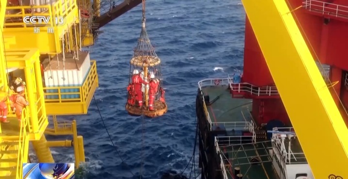 总台央视记者 张丛婧:平台还在安装中,需要乘坐“吊笼”才能上去,这也是海上非常独特的一种交通工具。