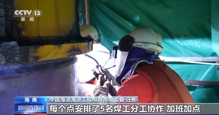 中国海油海油工程电焊高级监督 汪彬:目前导管架和组块只是像积木一样拼在了一起,还不稳固,每晚一分钟焊接,就会多一分风险。我们根据现场施工空间,每个点安排5名电焊工分工协作,加班加点,争取早日完成焊接。
