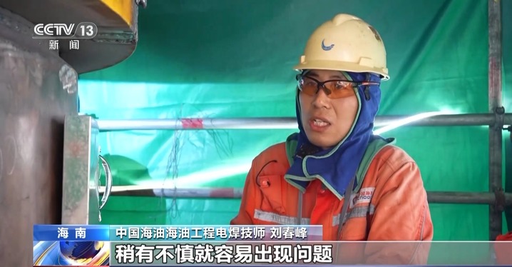 中国海油海油工程电焊技师 刘春峰:海上风力和湿度都比较大,焊接空间非常狭窄,操作难度很大,稍有不慎就容易出问题,非常考验我们的焊接技术。