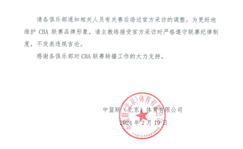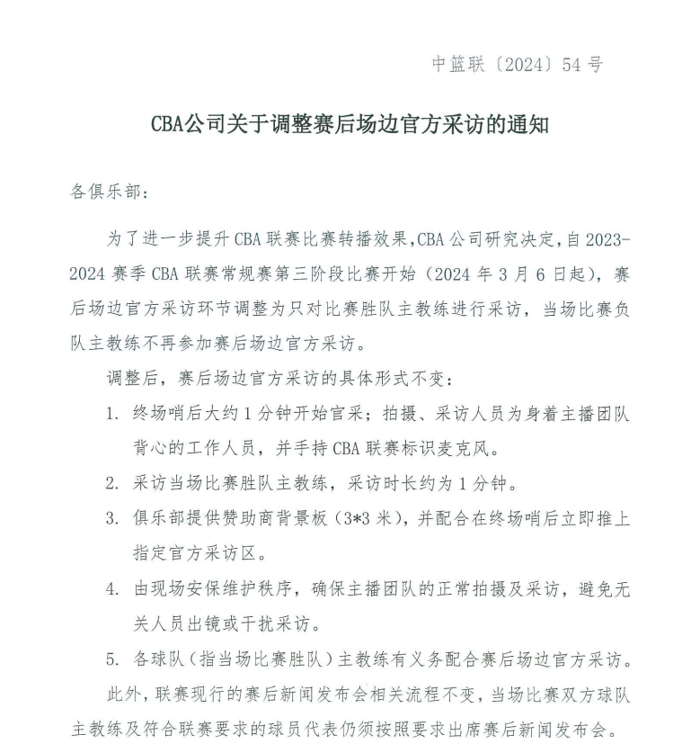 CBA调整赛后场边采访通知全文: