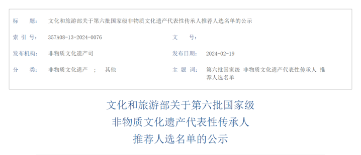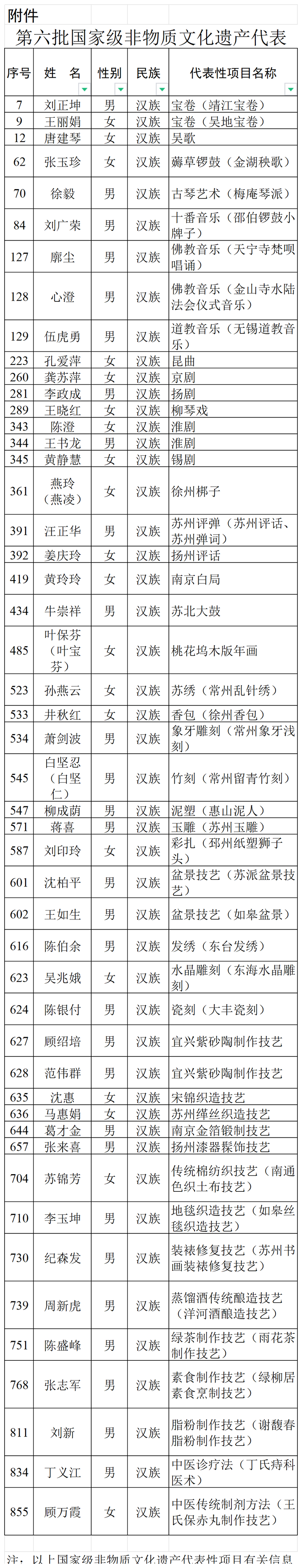 19日,文化和旅游部公示了第六批国家级非物质文化遗产代表性传承人推荐人选名单。此次公示的名单共计有958人,江苏省入选49人。
