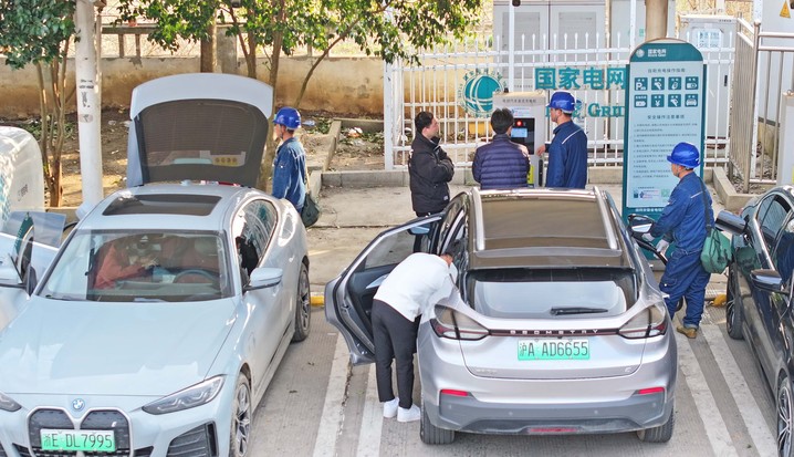 △ 2024年2月17日,安徽滁州来安县大英镇境内的G36宁洛高速曹庄服务区,滁州市供电公司工作人员协助电动汽车车主高效解决充电中遇到的问题。