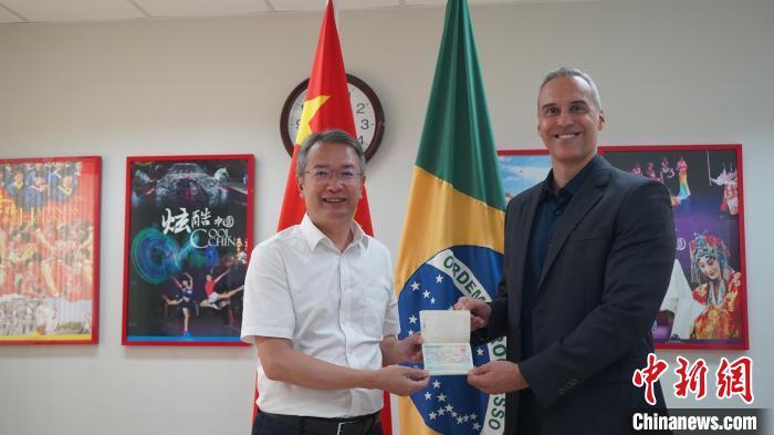 当地时间2月19日,中国驻巴西使馆向巴西公民丹尼·内托颁发使馆领区首张十年多次赴华商务签证。