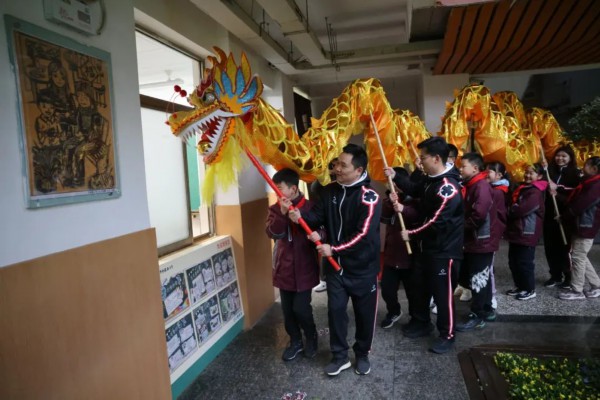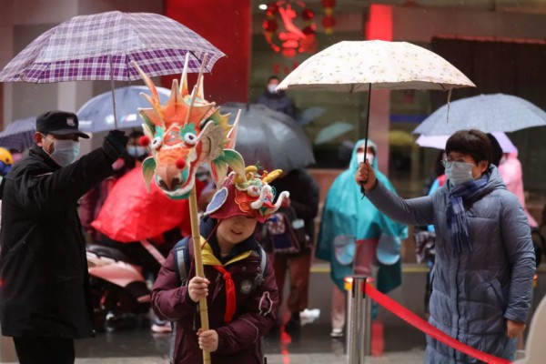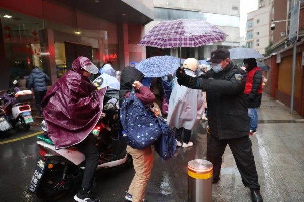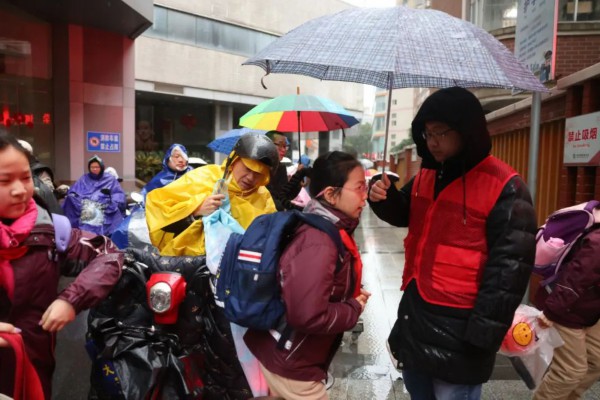2月21日,南京出现大风大雨天气,鼓楼区赤壁路小学,保安、教师、志愿者护送学生有序进入校园。