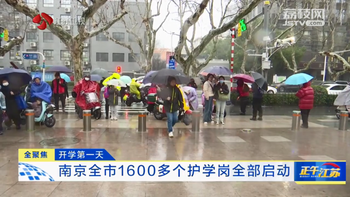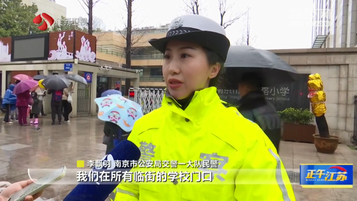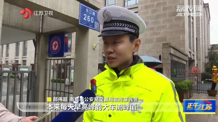 南京市公安局交警一大队民警李飘羽说:“我们在所有临街的学校门口都安排了护学警力以及我们家长志愿者,来共同维护校门前的交通秩序。一方面保证学生入校的安全,一方面也减少交通压力。”