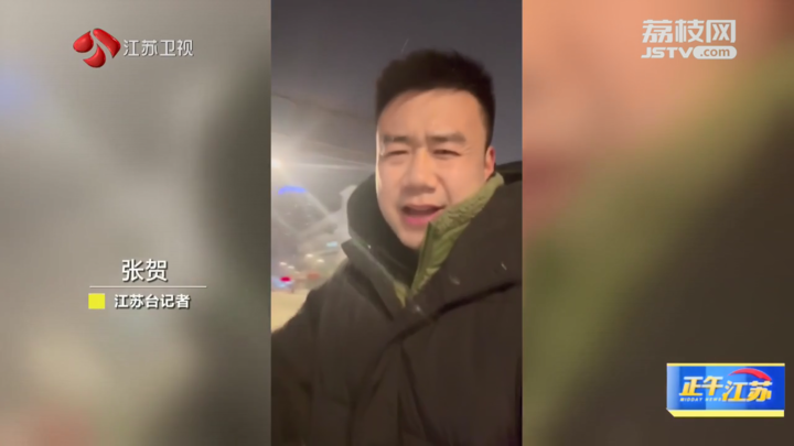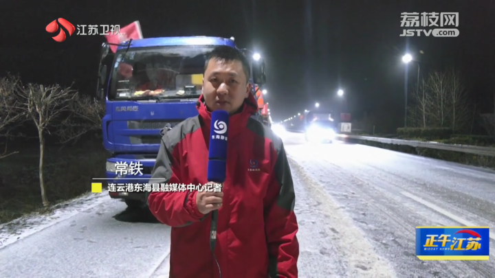 连云港东海县融媒体中心记者常铁:“我现在是在464省道东海西出口路段,现在的室外温度已经是来到了零下2度。现在的雪是越来越大,打到脸上也是非常地疼。我们可以看到,雪落到路面以后就迅速地结成冰。”