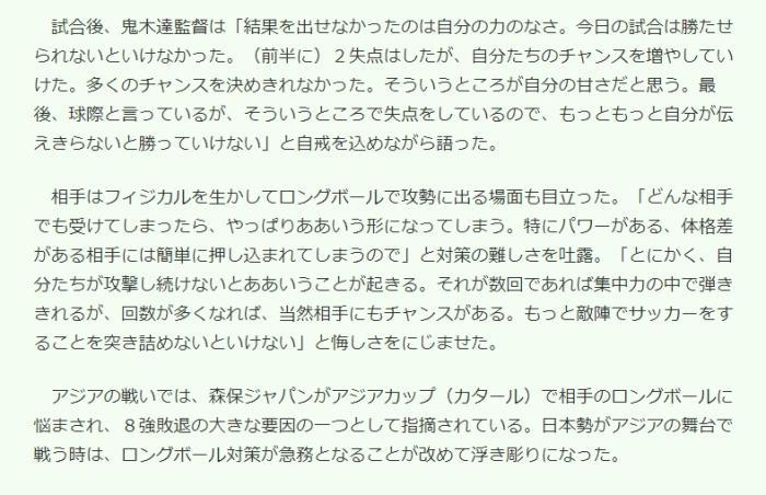 有日媒认为,如今日本足球在面对长传冲吊的打法时遇到了困难。川崎前锋主帅鬼木达赛后也提及这一点,他表示:“面对身体优势很大的对手,我们很容易被挤开。如果我们不持续给对手施压,那么对手持续进攻之下,自然会取得进球机会。”