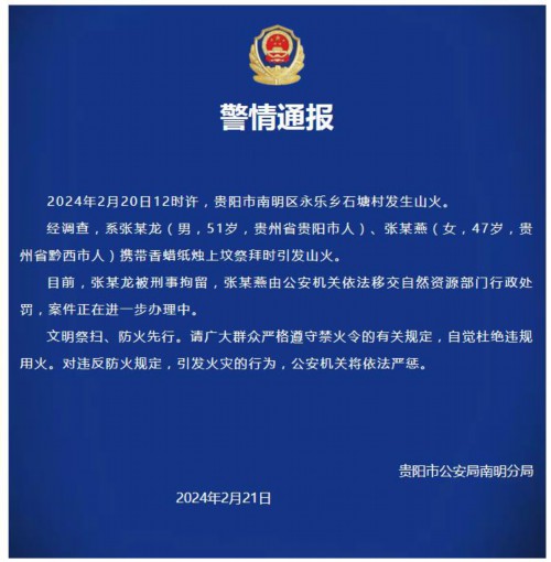 荔枝新闻讯 据贵阳市公安局南明分局2月21日通报,贵阳市南明区永乐乡石塘村发生山火,因两人上坟祭拜引发,已被采取强制措施