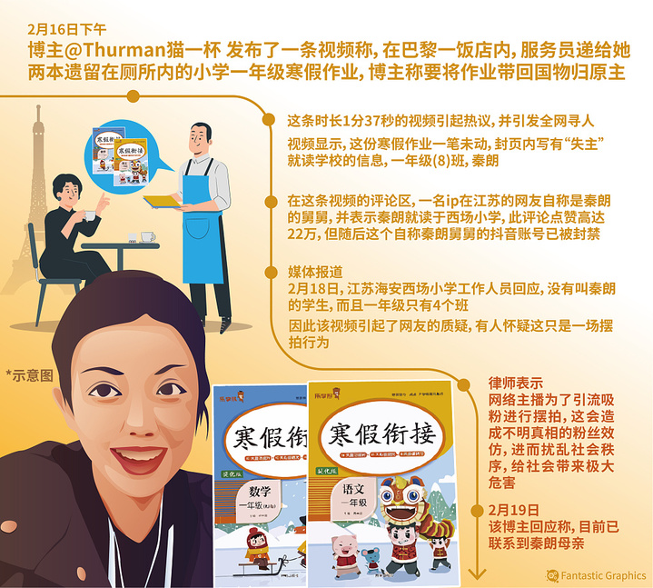 近日,一则“在巴黎捡到了寒假作业”搞笑又离奇的故事在短视频平台冲上热搜。某博主发布了视频称在巴黎一饭店内,服务员递给她两本遗留在厕所内的小学一年级寒假作业,封页内有就读学校、班级等信息。该博主称要将作业带回国物归原主。这条时长1分37秒的视频不仅引发了热议,也动员了广大网友全网寻人。