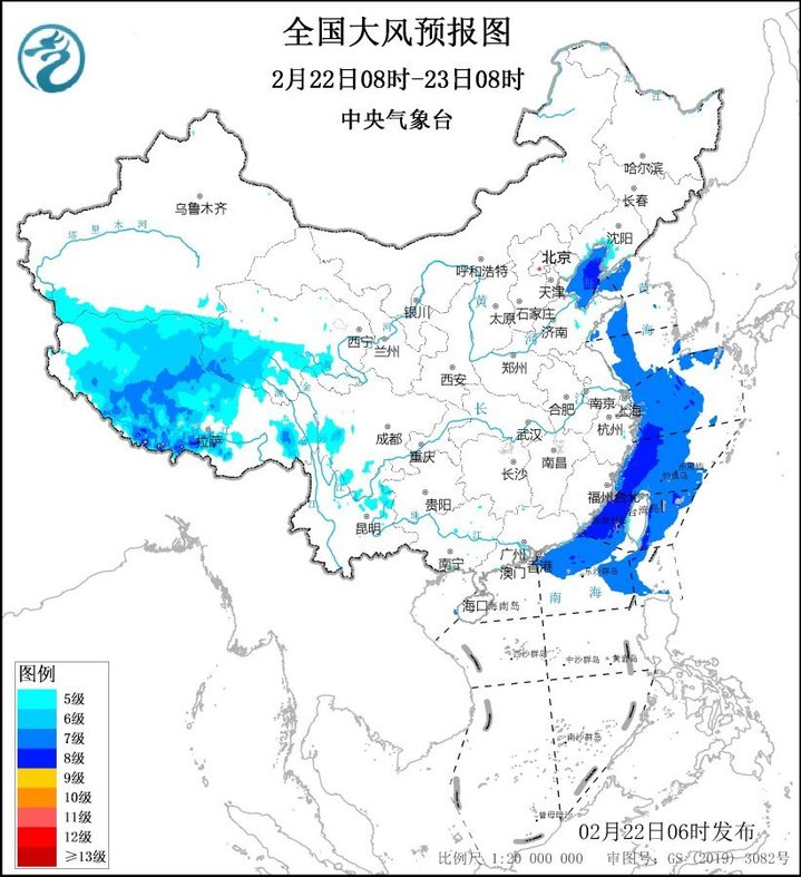 预计,2月22日08时至23日08时,西藏中西部、青海西南部、辽东半岛、云南东部等地的部分地区有5~6级大风,阵风7~8级;渤海、渤海海峡、黄海西部海域、东海西部海域、台湾海峡、台湾以东洋面、南海东北部将有7-8级、阵风9级的偏北到东北风。