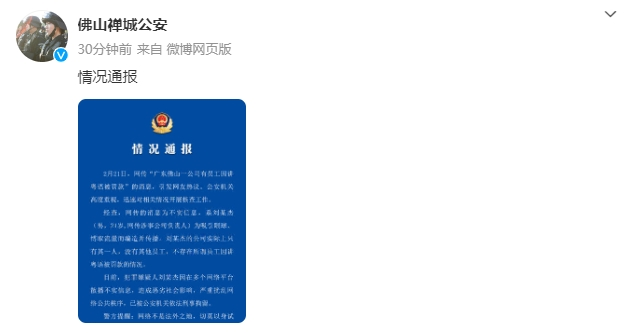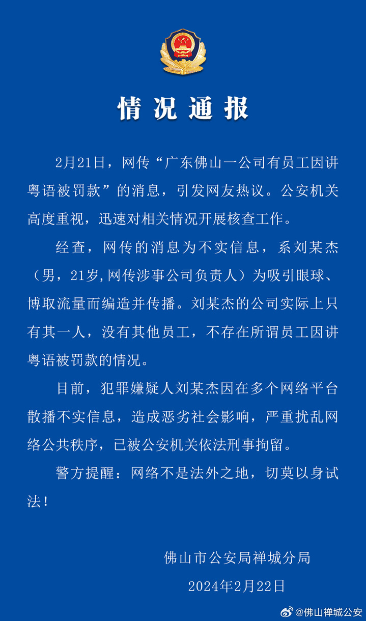 2月21日,网传“广东佛山一公司有员工因讲粤语被罚款”的消息,引发网友热议。公安机关高度重视,迅速对相关情况开展核查工作。