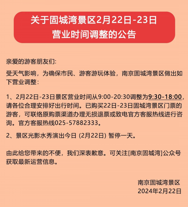 受天气影响,南京部分景区发布临时闭园、暂停运营公告。