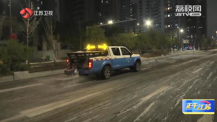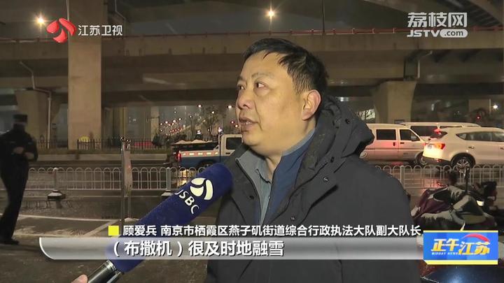 江苏台记者沈灿:“我现在是在南京市栖霞区的晓庄立交附近,这里也是城北地区交通较为繁忙的路段之一。通过镜头可以看到,这里不仅有纵横交错的高架桥,也有城市快速化道路、主干道。同时,这里还有地铁的几个出入口。现在是晚上九点,城管队员抓紧对各个道路开展扫雪除冰作业。”