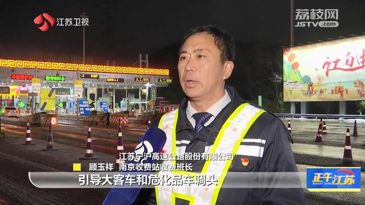 江苏宁沪高速公路股份有限公司南京收费站收费班长顾玉祥:“我们目前的主要工作是引导大客车和危化品车调头,提醒驾驶人员减速慢行。”