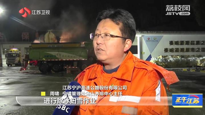 江苏宁沪高速公路股份有限公司宁镇管理处汤山养排中心主任周啸:“我们辖区共分为4个路段进行除冰扫雪作业,每个路段共配备了2台综合除雪车。同时,配备4-6名操作手进行梯队作业。目前,吹雪作业已经进行了3轮次,撒布融雪剂120吨左右。”