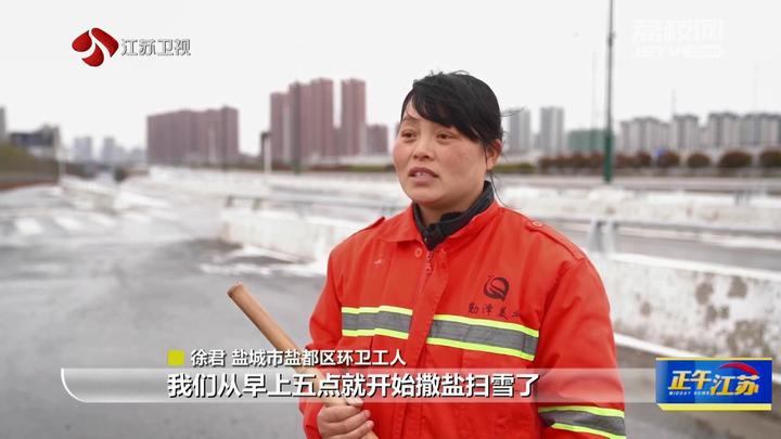 盐城市盐都区环卫工人徐君说:“我们从早上五点就开始撒盐扫雪了,主要针对非机动车道一直做到现在。现在,我们保洁的范围内基本上看不到大面积的积雪。”