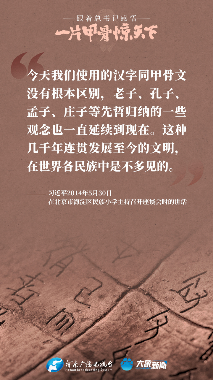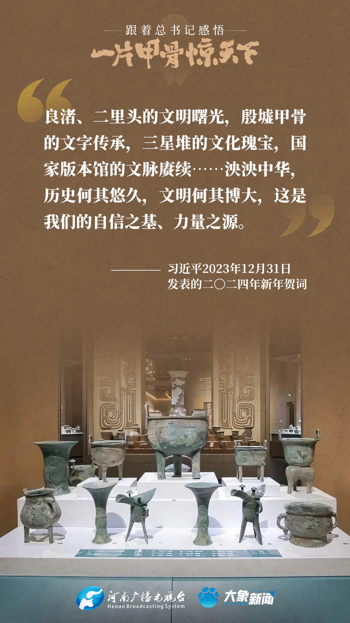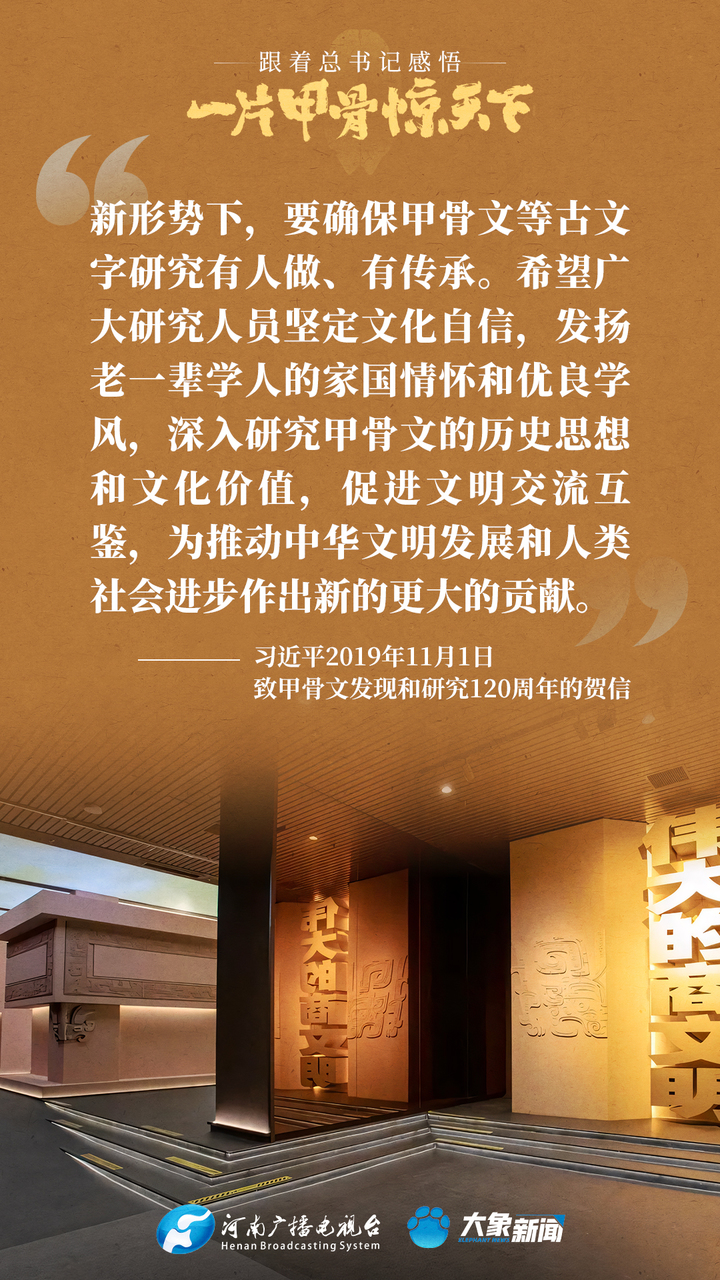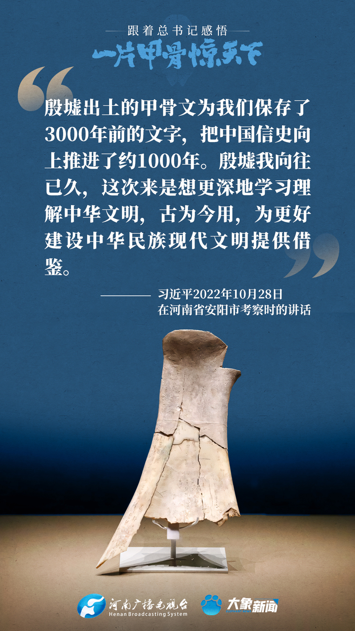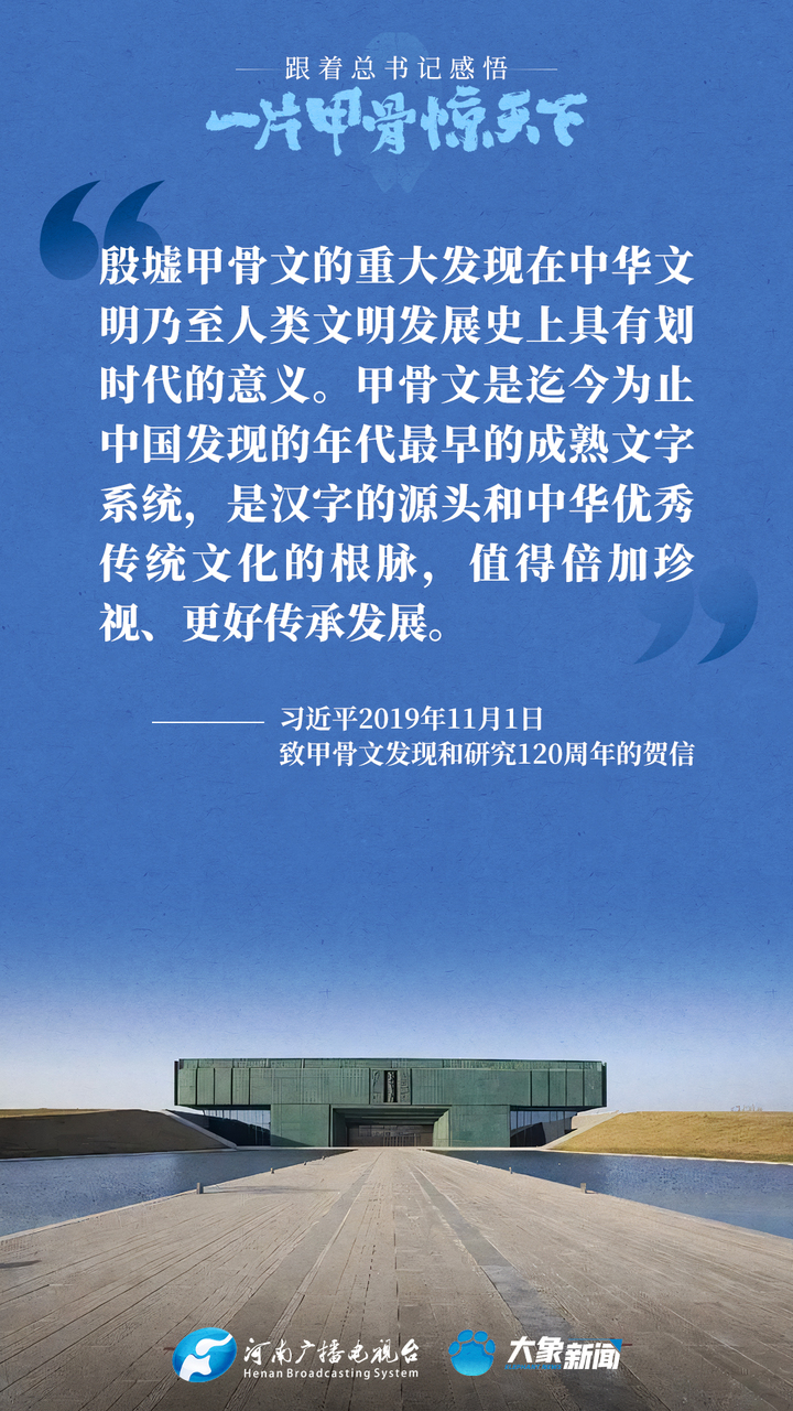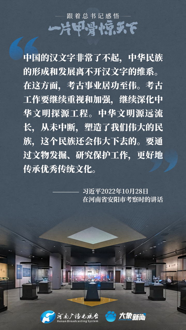 党的十八大以来,习近平总书记多次就殷墟和甲骨文保护研究利用工作作出重要讲话重要指示,为我们坚定文化自信,传承发展中华优秀传统文化提供了根本遵循。大象新闻邀您一起回顾、学习。