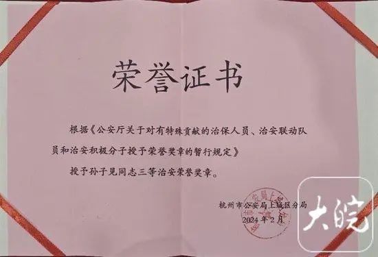 2月25日晚,杭州“劝架车主”孙子见律师告诉记者,杭州市公安局上城区分局当天授予他三等治安荣誉奖章。