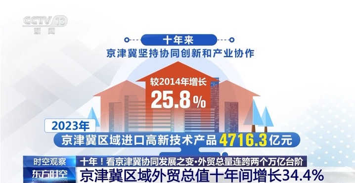十年来,京津冀坚持协同创新和产业协作,2023年,京津冀区域进口高新技术产品4716.3亿元,较2014年增长25.8%。