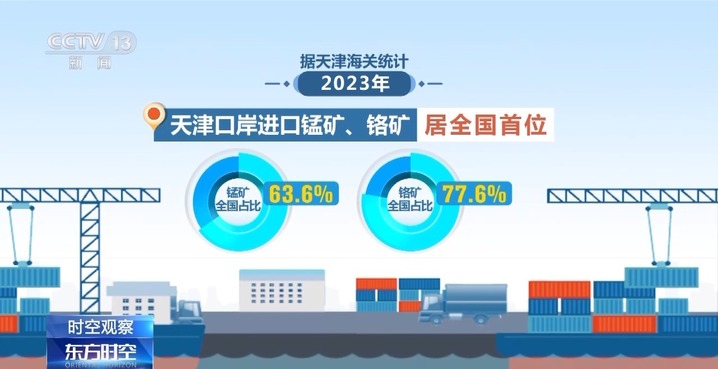 锰矿作为一种重要的矿产资源,主要应用于钢铁行业,对提升合金的性能发挥着至关重要的作用。依托京津冀现代化立体交通运输网络,天津港进口矿产品通过铁路、公路运往东北、西北、华北等内陆腹地,为企业稳产保供、经济高质量发展提供动力。 据天津海关统计,2023年,天津口岸进口锰矿、铬矿居全国首位,全国占比63.6%、77.6%。