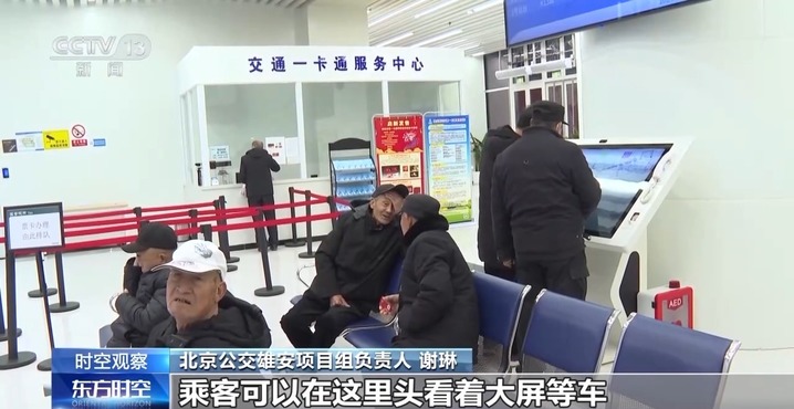 北京公交雄安项目组负责人 谢琳:现在这个位置是丹溪枢纽的候车大厅,大屏上提供进入丹溪枢纽的五条公交线路的发车时间,乘客可以在这里看着大屏等车,不需要在站台上去候车。