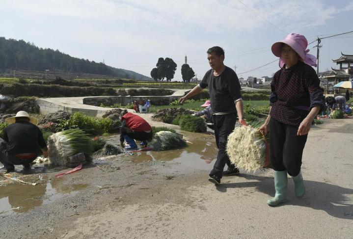 2024年2月21日,贵阳市花溪区黔陶乡农户搬运刚采收的香葱。新华社记者 胡星 摄
