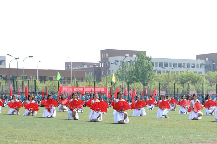 2019年4月26日,承德应用技术职业学院学生在天津中德应用技术大学运动会开幕式上表演。新华社发
