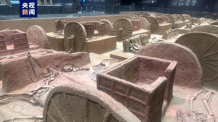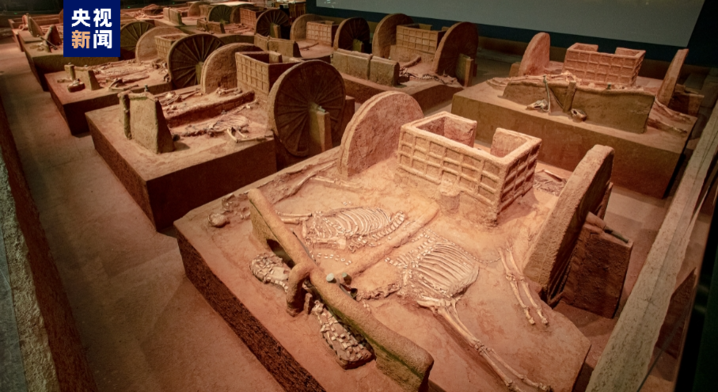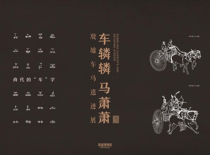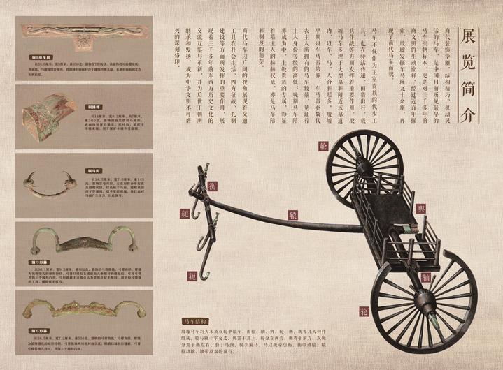 “车辚辚马萧萧”殷墟车马遗迹展,展厅内23座车马坑遗迹,矩阵式陈列,气势震撼。展示了商代装饰华丽、结构精巧、机动灵活的马车,是中国目前所见最早的马车实物标本,更是对三千多年前商文明的生动诠释。经过近百年探索,殷墟发掘车马坑九十余座,再现了商代马车面貌。马车不仅作为王室贵族的代步工具,也在驿站传递、田猎出行、载兵作战等方面发挥着重要作用。殷墟马车多埋于大型墓葬附近或墓道内、以车、马、人合葬居多。殷墟早期以车马器陪葬,车马器套数代表主人所拥有的马车数量,见证着主人身份等级的高低;晚期马车陪葬成为中、上级贵族的专属,彰显着墓主人的赫赫权威,亦是马车陪葬制度的萌芽。