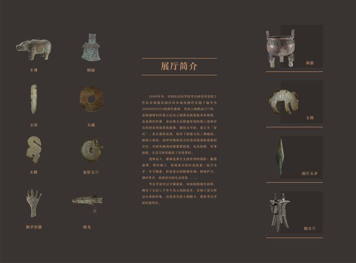 “长从何来-殷墟花园庄东地亚长墓专题展厅”以“亚长”这位殷商时期的大将军为主人公,通过亚长墓出土的577件文物,生动展现了他的赫赫战功、排兵布阵、生活起居等场景。亚长墓是殷墟继妇好墓之后出土随葬品数量最多的墓葬。据铭文可知,墓主为“亚长”。透物见人,墓葬是墓主生前世界的缩影:觚爵鼎尊、璧琮戚玦,体现亚长的位高权重;钺刀戈矛、车马辎重,彰显亚长的赫赫军威;锛凿铲刀、璜环笄觿,再现亚长的生活场景。考古学家经过不懈探索,如侦探般抽丝剥茧,揭开了尘封三千年不为人知的史实,呈现了亚长鲜活立体的形象,这是亚长的人格魅力,更是考古学的价值所在。