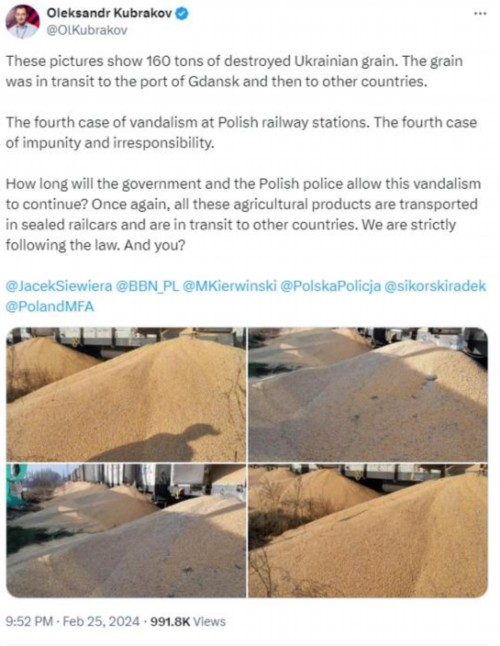 乌克兰副总理库布拉科夫在社交平台X上发布了成堆粮食堆在火车车外的图片。“这些照片上是160吨被毁坏的乌克兰粮食。这些粮食正在运往格但斯克港的途中,然后运往其他国家。”布拉科夫写道,“这是波兰火车站发生的第四起破坏行为,第四起有罪不罚和不负责任的事件。”