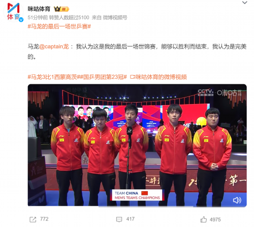 老将马龙同样在先失一局的情况下,3:1取胜西蒙·高茨,帮助国乒男团锁定胜局。