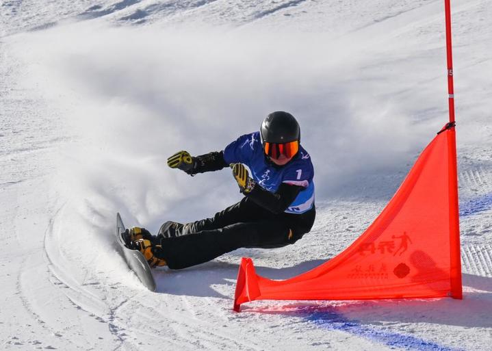 1月25日,在内蒙古赤峰喀喇沁旗举行的第十四届全国冬季运动会单板滑雪公开组男子平行大回转比赛中,内蒙古队选手班学福夺金。新华社记者 刘磊 摄