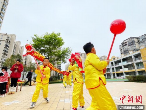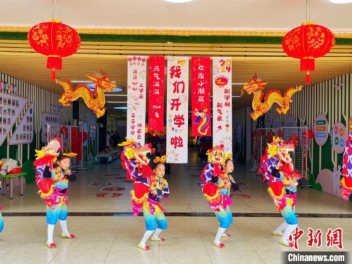 26日,在永定区城东幼儿园内,孩子们身着鲜艳的表演服,手持龙具,或翻腾跳跃,或盘旋飞舞,入园的孩子们和家长们被深深吸引,掌声、欢呼声此起彼伏。
